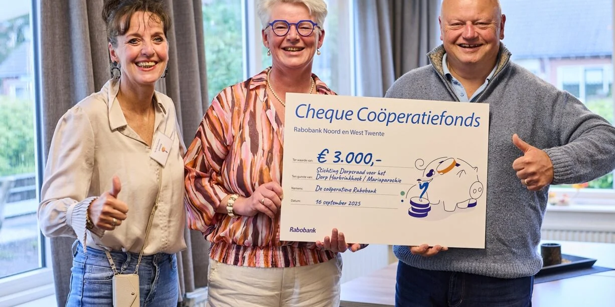 16 September was de projectgroep Dorpsapp HM van de Dorpsraad samen met andere verenigingen uitgenodigd door de Rabobank Noord West Twente. In het Cultuurhoes in Albergen werd door Jeanette van de Aa een cheque van 3.000 euro uitgereikt voor de ontwikkeling van de Dorpsapp. In totaal werd er € 57.250 geschonken aan 13 verenigingen. Een geweldig mooie bijdrage van het Coöperatiefonds van de Rabobank. Naast de Rabobank zijn er nog andere fondsen aangeschreven en dat resulteert erin dat we de ontwikkelingskosten van de Dorpsapp HM, circa 9.000 euro, al voor een groot deel rond hebben. De projectgroep Dorpsapp van de Dorpsraad bedankt nogmaals alle gulle gevers voor hun bijdrage.
